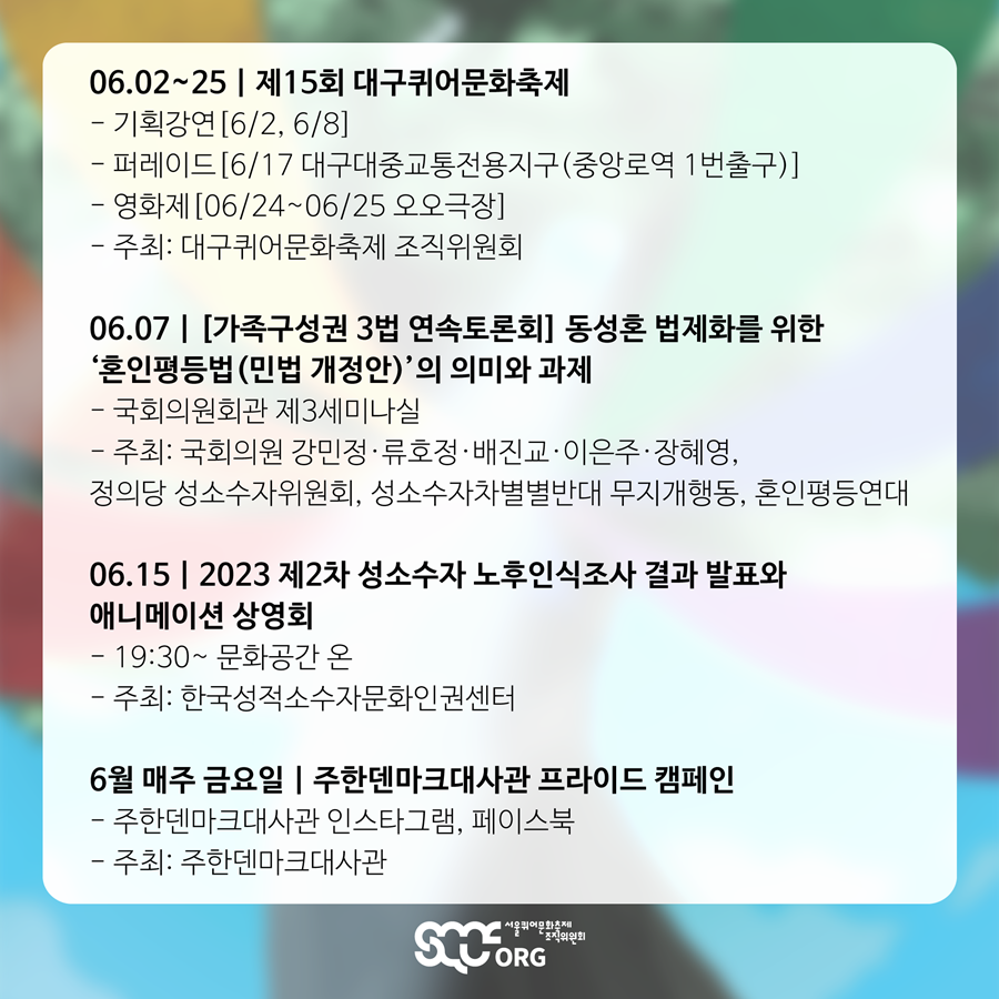 지난 6월 2일 기획강연으로 시작해 17일 퍼레이드를 앞두고 있는 대구퀴어문화축제, 7일 국회에서 열렸던 혼인평등법 토론회, 그리고 15일 오늘 성소수자 노후인식조사 발표와 상영회, 마지막으로 6월 매주 금요일에 진행되는 덴마크대사관의 프라이드 캠페인까지!