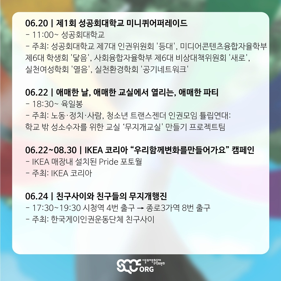 20일 내일 진행되는 성공회대 미니퀴어퍼레이드에서부터 22일 애매한 파티, 22일부터 8월까지 쭉 진행되는 이케아의 우리함께변화를만들어가요 캠페인, 그리고 24일 친구사이와 친구들의 무지개행진까지!