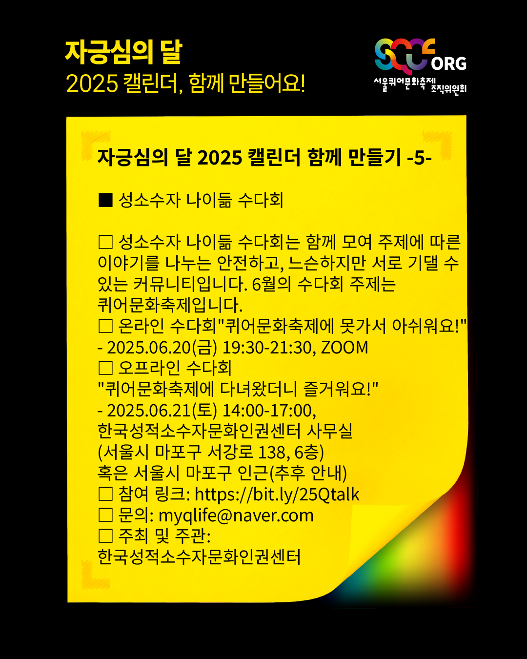 - 2025.06.21(ํ ) 14:00-17:00, ํ๊ตญ์ฑ์ ์์์๋ฌธํ์ธ๊ถ์ผํฐ ์ฌ๋ฌด์ค(์์ธ์ ๋งํฌ๊ตฌ ์๊ฐ๋ก 138, 6์ธต) ํน์ ์์ธ์ ๋งํฌ๊ตฌ ์ธ๊ทผ(์ถํ ์๋ด)