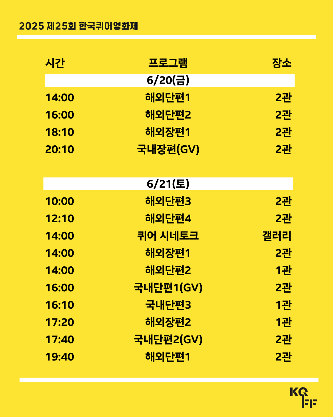 ๐ ์์์ผ์ ํ ์น์ฌ์ดํธ์์ ๋ณด๊ธฐ: https://www.kqff.co.kr/2025_timetable (ํ๊ตญํด์ด์ํ์ ์น์ฌ์ดํธ)