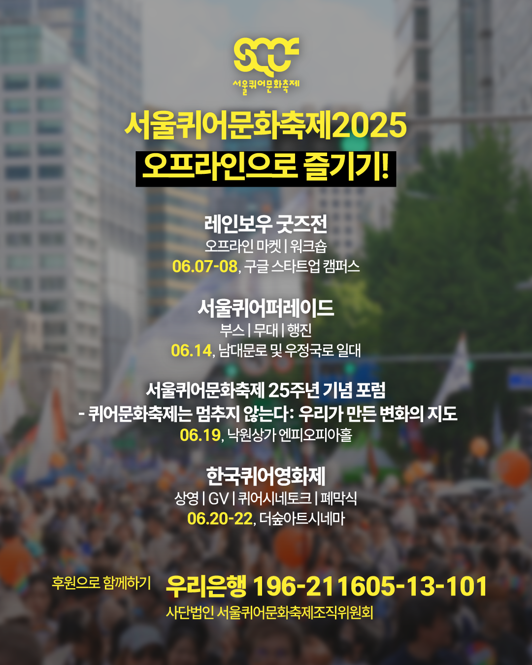 - 후원계좌: 우리은행 196-211605-13-101 사단법인 서울퀴어문화축제조직위원회