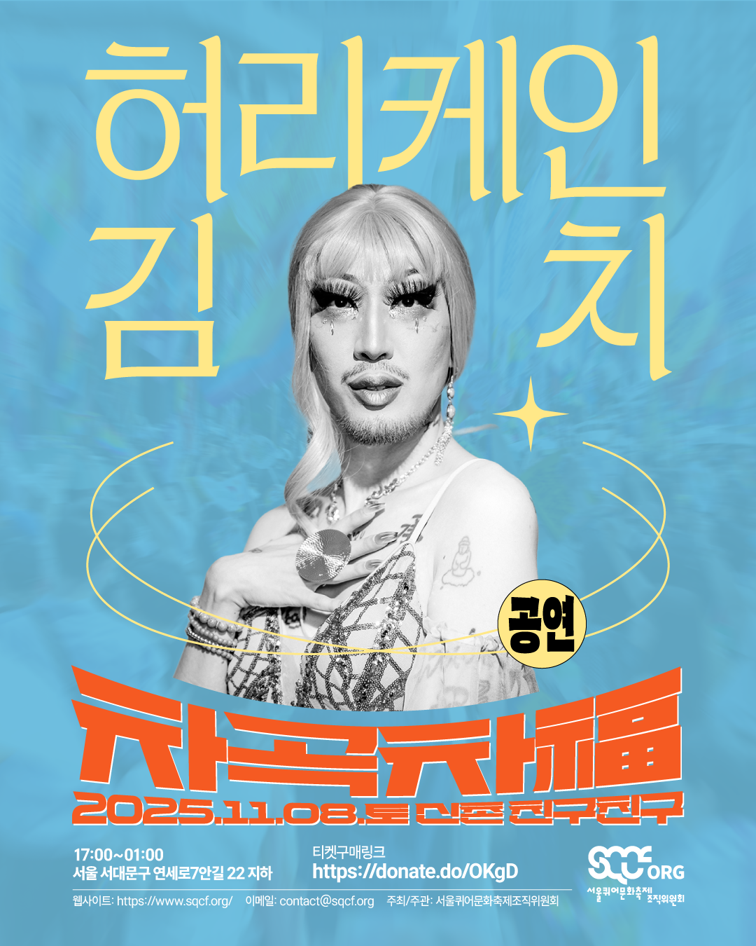 - 허리케인 김치는 공연자, 기획자, 엠씨, 싱어송라이터, 활동가로 활동하고 있는 드랙퀸입니다. 그는 서울드랙퍼레이드의 공동설립자이며, 포브스 선정 예술인이자 미 국무부 IVLP 동문이기도 합니다. (SNS @hurricanekimchi @seouldragparade)